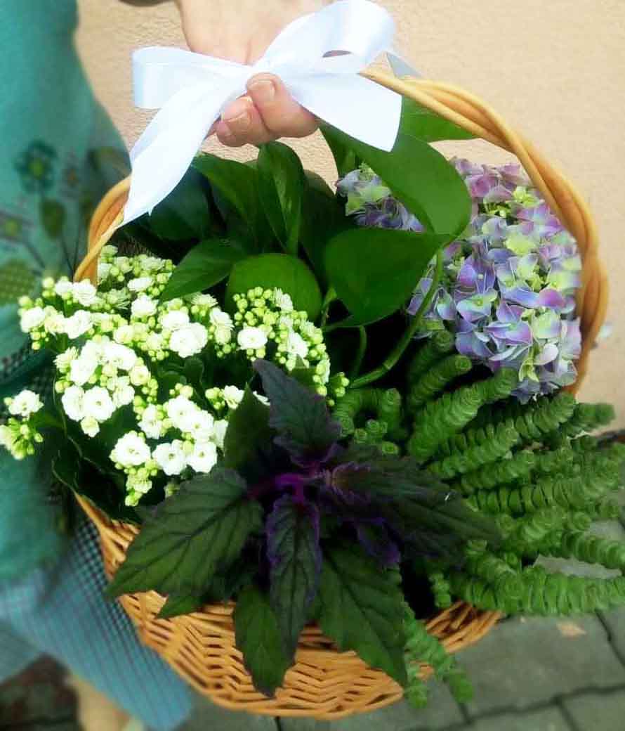 У цьому кошику гармонійно уживаються 5 горщків: папороть, сингоніум, пілея і квітучий коланхое.