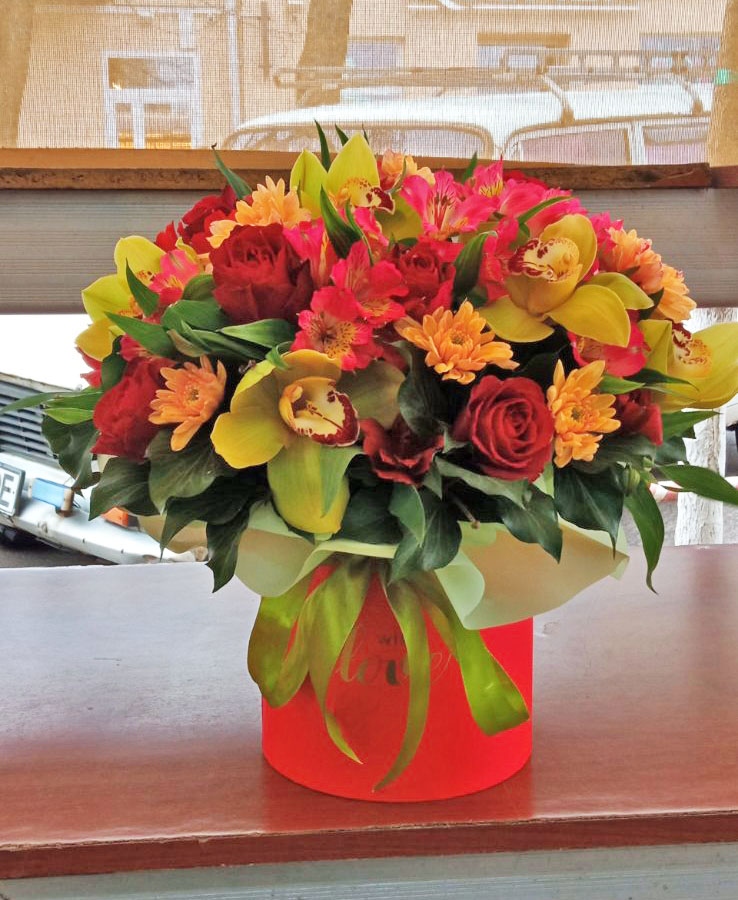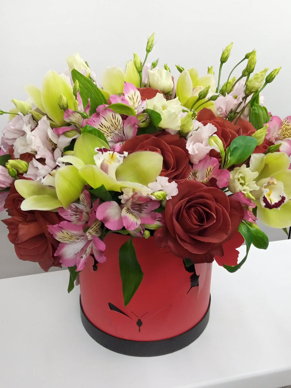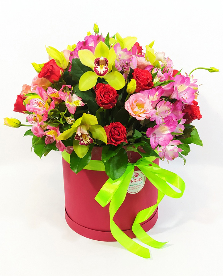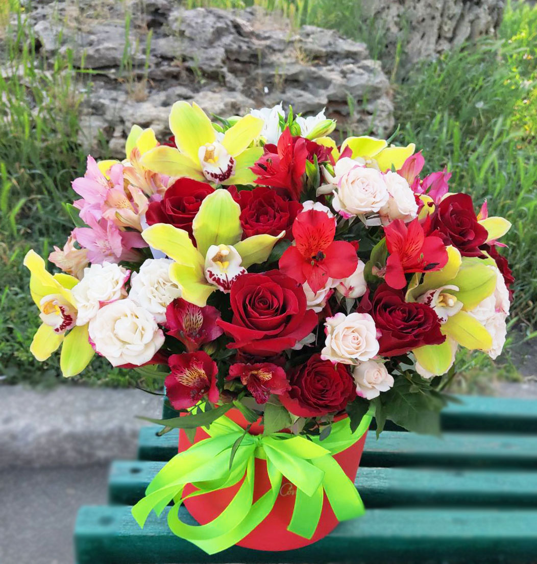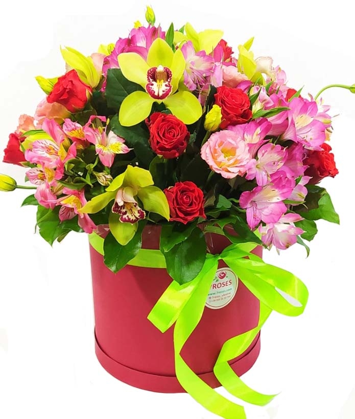 Контраст завжди дає ефектний вигляд: світло-зелені Королівські Орхідеї в оточені маленьких темно-червоних троянд, альстромерій, еустом