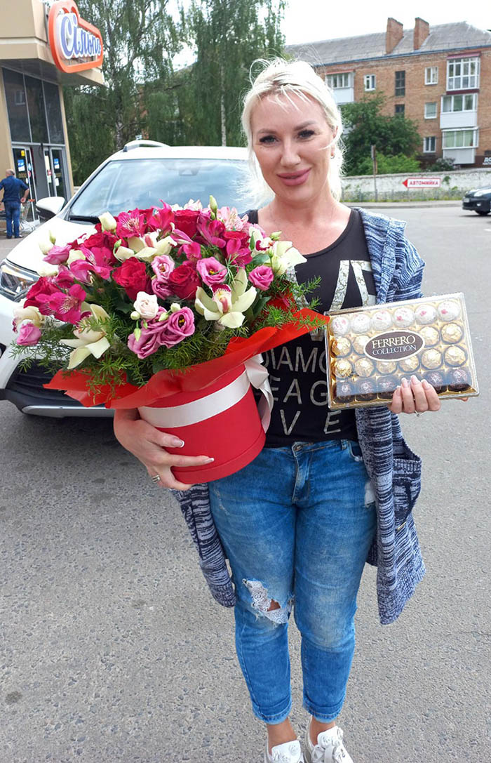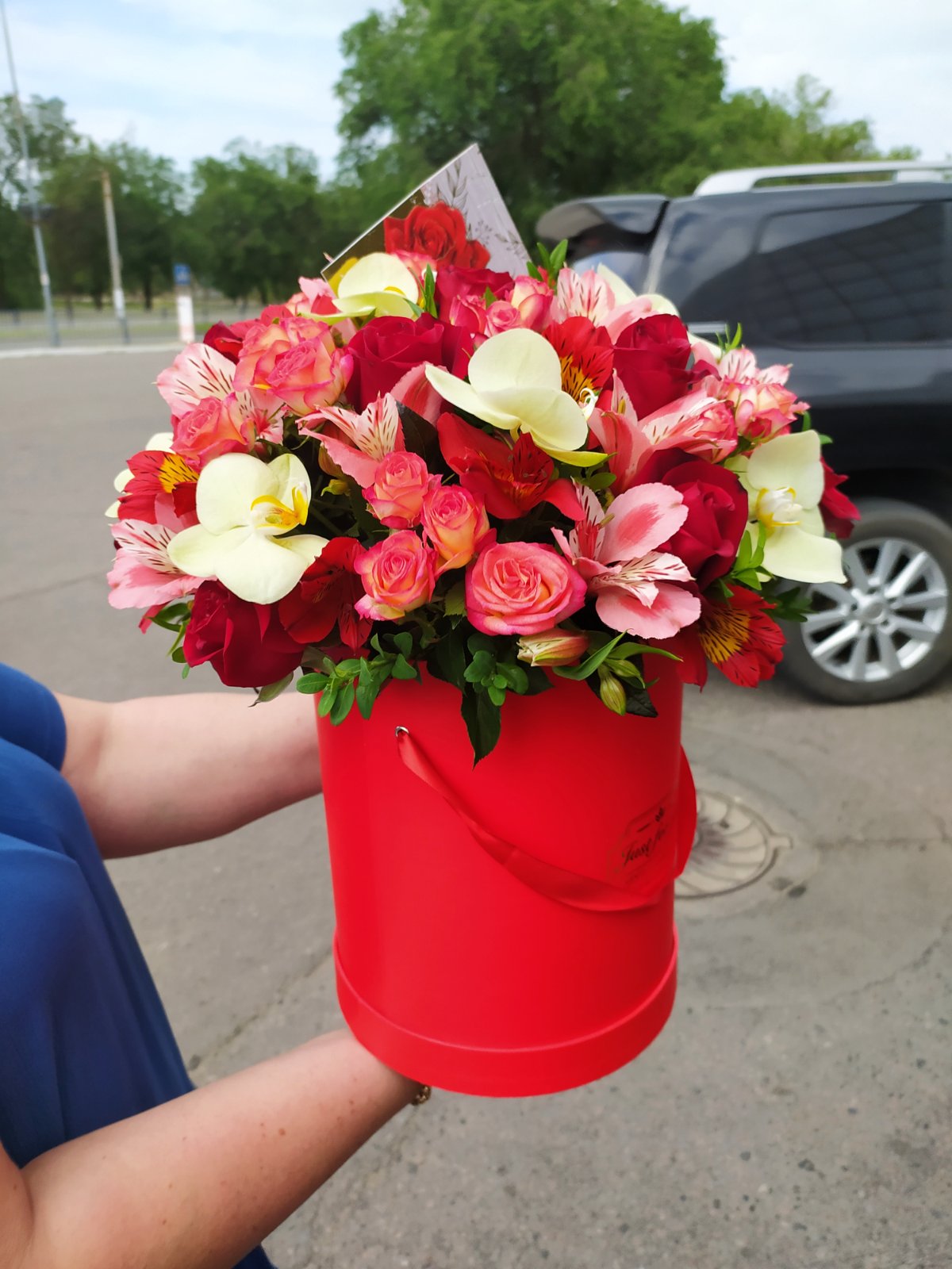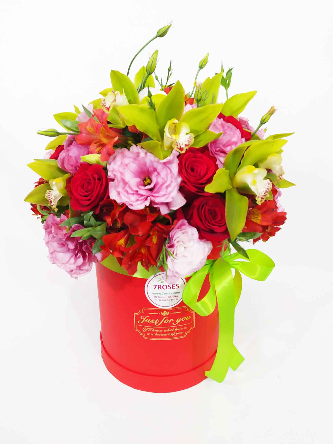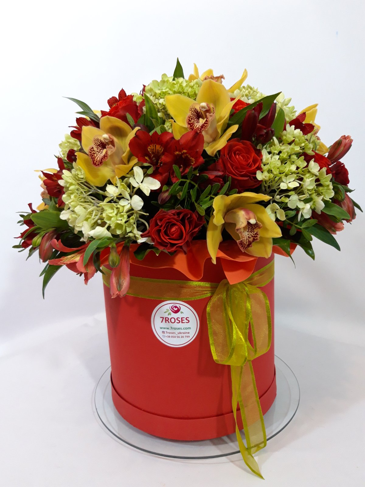 Висота та діаметр коробки близько 20 см. Висота композиції 40-45 см. Колір коробки може відрізнятися від кольору на фото.
