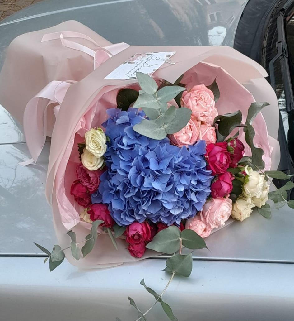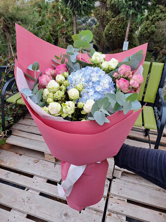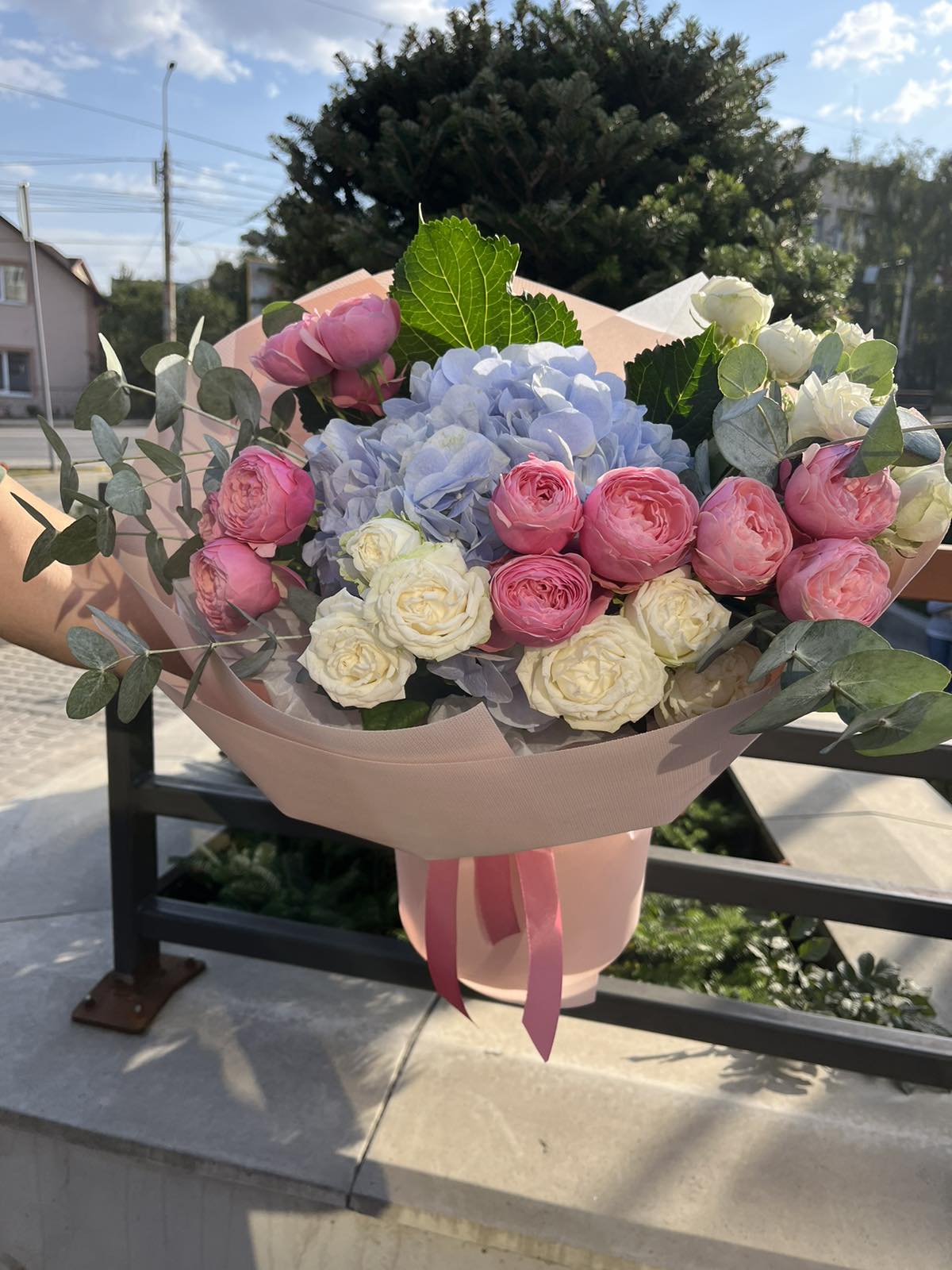 Елегантний букет з однієї великої кулі гортензії, яка може бути від світло-блакитного до синього кольору в залежності від наявності гортензій у нашому магазині в даний момент. До цієї розкішної шапки прилягають піоноподібні троянди спрей: на кожній гілочці - до 5 чарівних троянд різного розміру та різного ступеня розкритості.