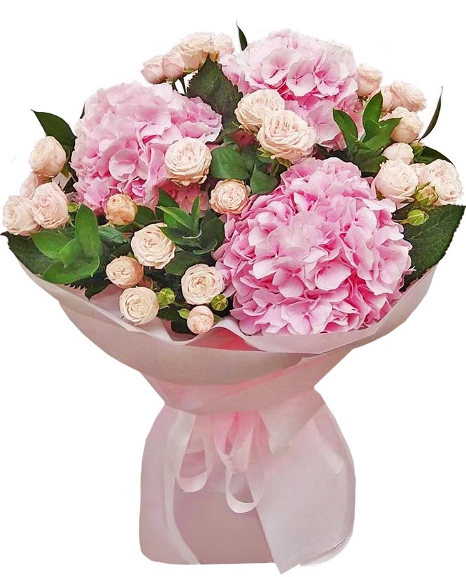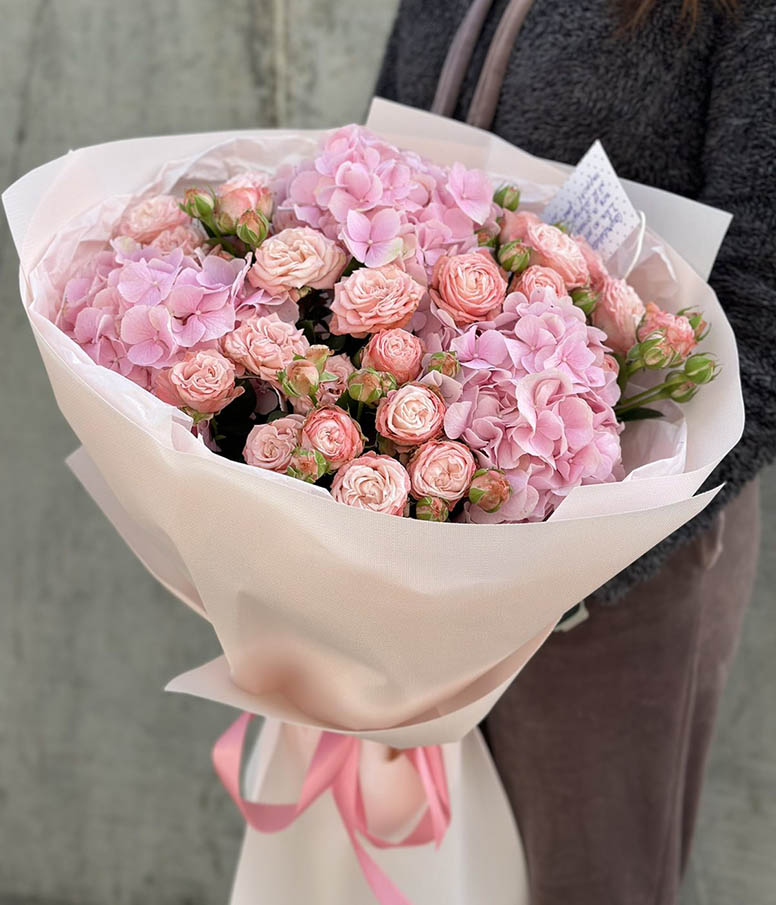 Ідеальної форми кулі рожевої гортензії чудово поєднуються з кущовими рожевими або малиновими піоноподібними трояндами в цьому чудовому букеті.