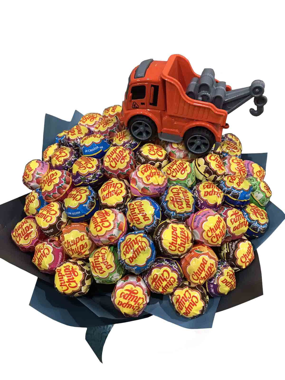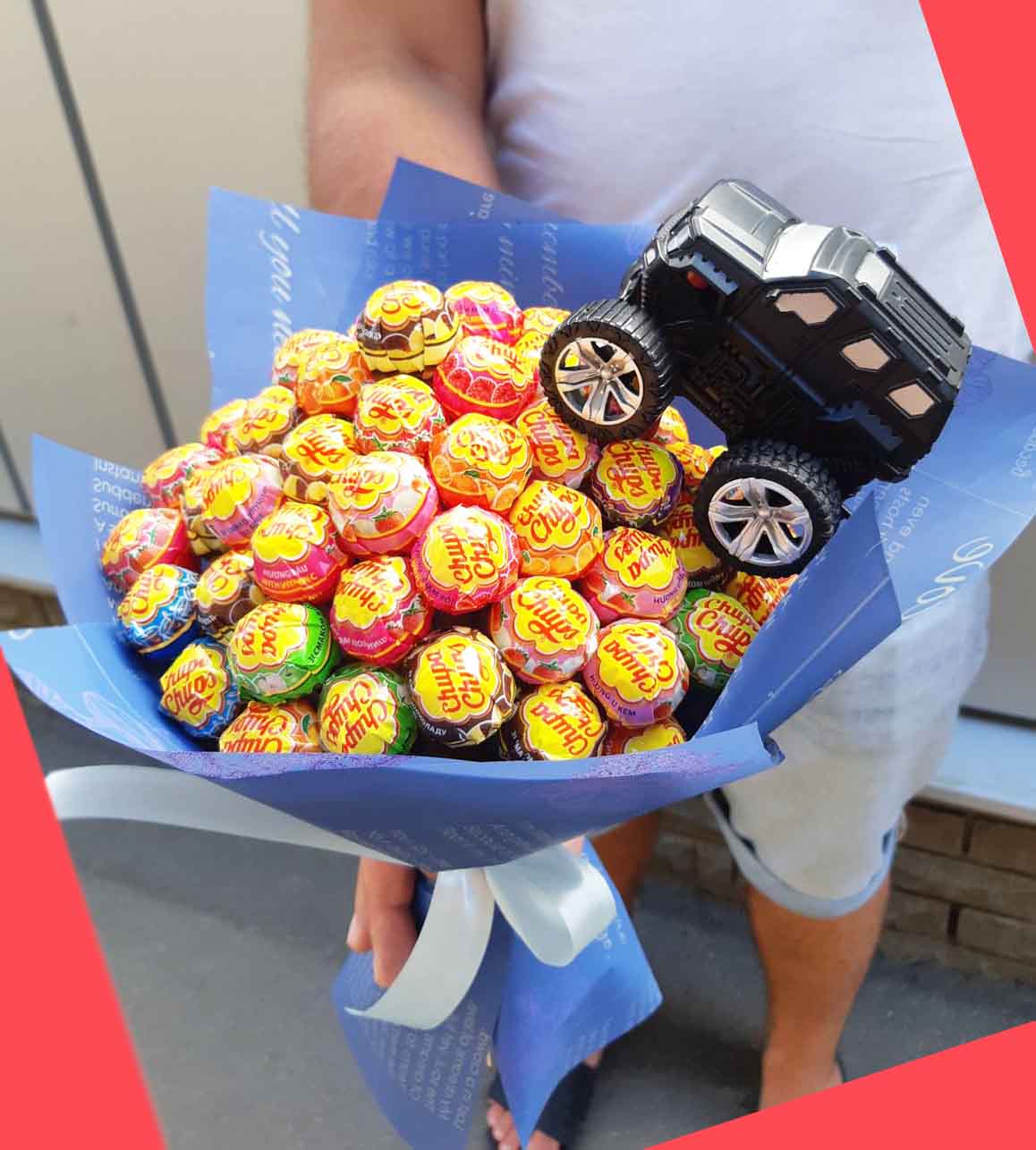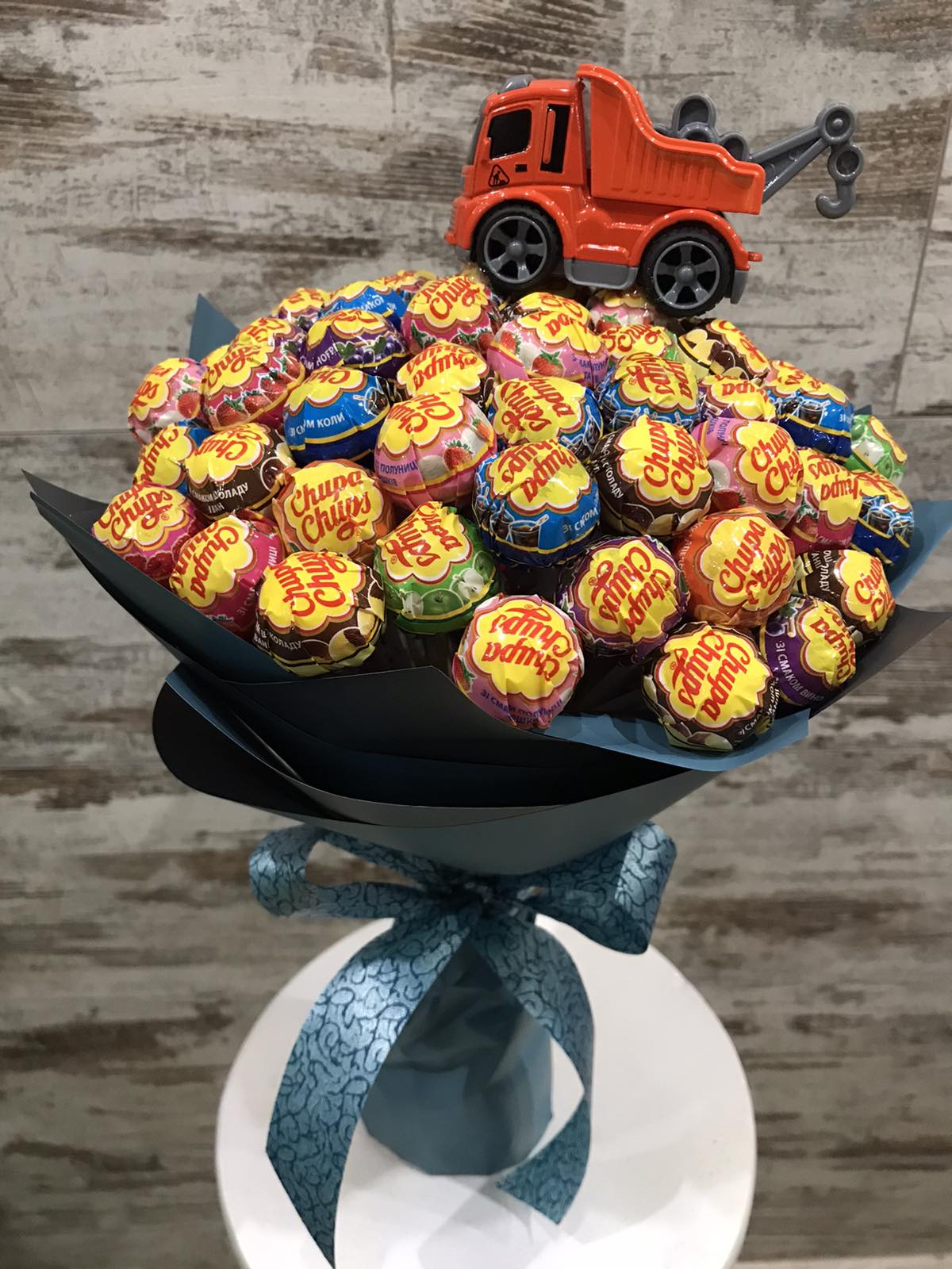 Букет з 65-70 цукерок Чупа-чупс і іграшки для хлопчика вiд 2 до 10-12 рокiв.