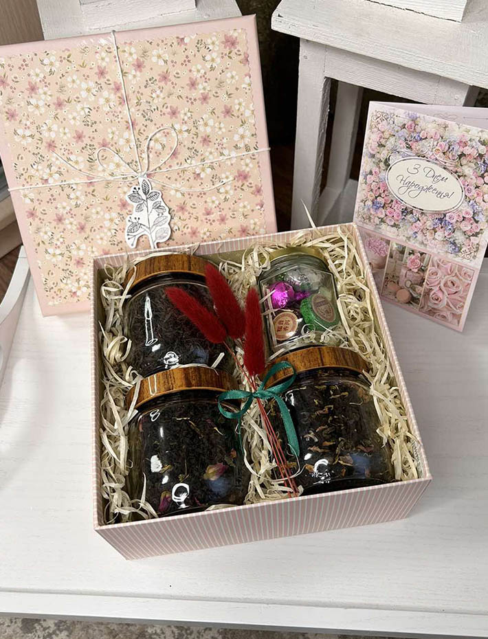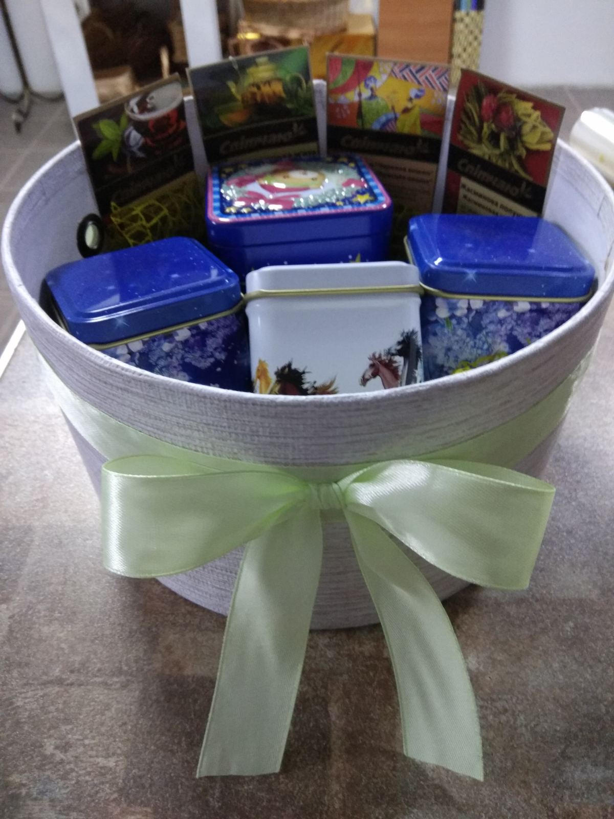 Банки з чаєм будуть покладені в подарункову коробку і перев'язані гарними чоловіками та пишним бантом.