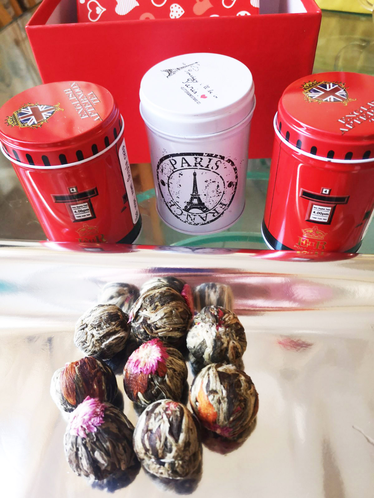 Тут 4 металеві банки, в три з яких входить по 80 або 150 грамів елітного китайського чаю (в залежності від вашого вибору "середня" або "велика" упаковка), а 4-й банку - 8 або 16 бутонів пов'язаного чаю 3-4 видів . Для заварки одного чайника потрібно всього один такий кулька-бутон і кожен з низ дасть прекрасну квітку, несхожий на інші. Адже вони в'яжуться вручну, тому кожна квітка можна вважати предметом мистецтва